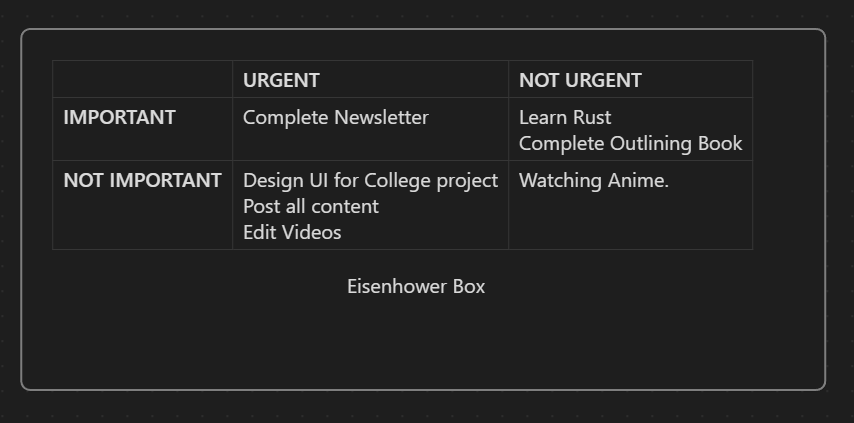 So I have a section in my To-do list called “Focus of Week”. This task should be done first with maximum energy, So I can generate quality work for that thing. For example, “Outlining the Novel.”